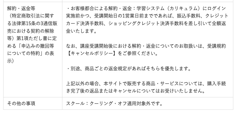 公式サイトを確認するとクーリングオフ適用対象外となっていますが利用規約には面談すると対応ができるとのことでした。個人的に条件が「厳しいな・・😅」と思いましたが、返金保証も設定されているようでした。